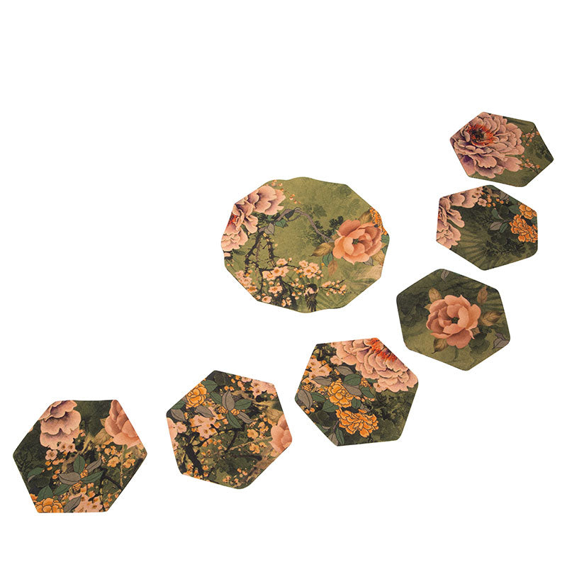 A double-layered cloth set designed for resting teapots and teacups. Same in color and material on both sides, each set includes six teacup rests and one teapot rest.