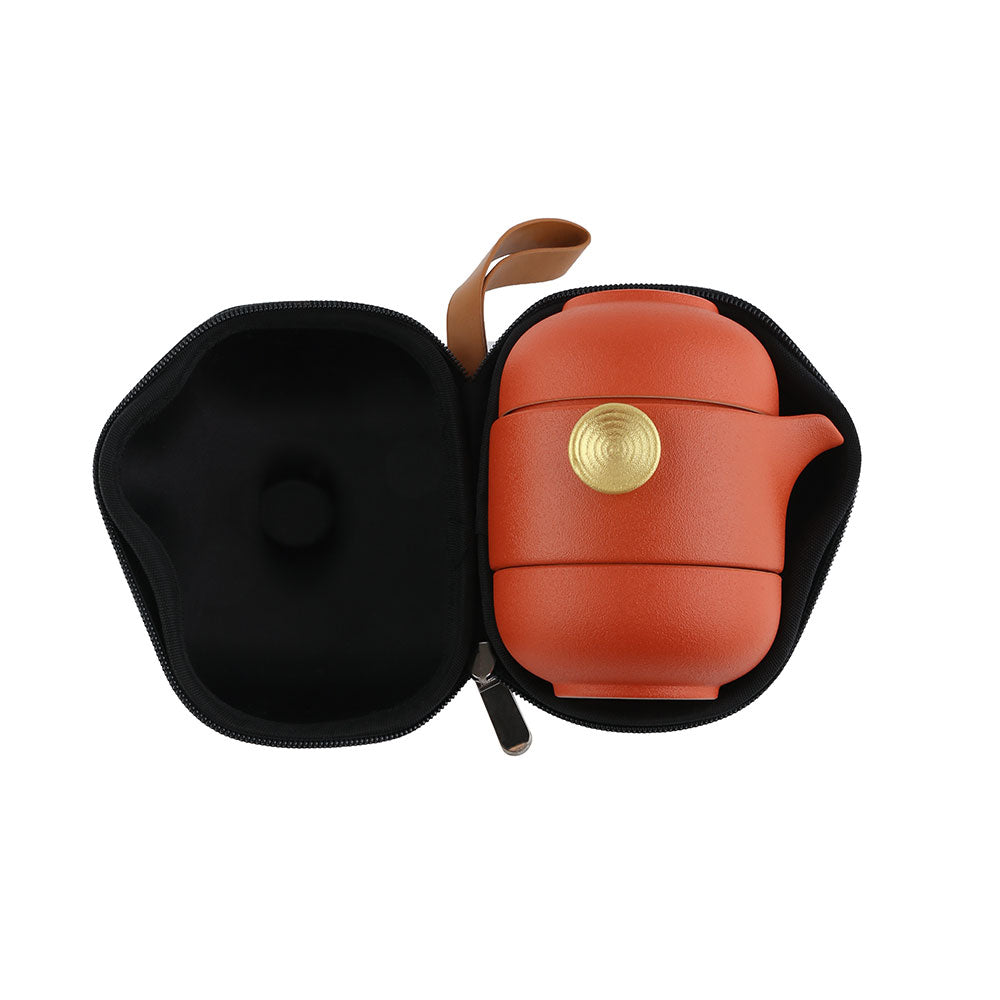 An easy gaiwan set with two teacups. The gaiwan is glazed on the exterior with vermilion glaze. The set stacks in a black compact bag for easy transport.